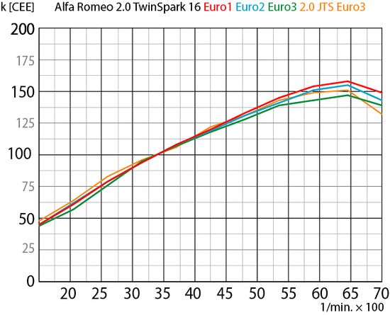 Červenou barvou je znázorněna křivka motoru AR 2.0 TwinSpark 16v první generace plnicího normu Euro1 (Alfa Romeo 146 Ti). Motor má poměrně plynulou výkonovou křivku s maximem atakujícím hranici 160 koní (159 k při 6450/min.). Modrou barvou je znázorněn průběh výkonu u motoru AR 2.0 TS 16v plnicího normu Euro2 (Alfa Romeo 156 první generace). Je vidět lineární pokles výkonu v pásmu od 4500/min., přičemž maximální výkon motoru klesá (155 koní při 6450/min.). Zelenou barvou je pak znázorněn průběh výkonu motoru AR 2.0 TS 16v poslední generace plnicí normu Euro3 (Alfa Romeo 156). Zde je již hodně výrazný propad výkonu v celém pásmu otáček, přičemž od hranice 5300/min. je již úbytek výkonu skutečně velký. Maximální výkon již nedosahuje ani hranice 150 koní (148,5 k při 5700/min). Paradoxem je, že u první generace tohoto motoru výrobce uváděl max. výkon 150 koní při 6300/min., zatímco u druhé a třetí generace uváděl 155 k při 6400/min., přičemž reálný výkon naopak evidentně klesal. Fungování tohoto motoru při plnění norem Euro4 a Euro5 je asi lepší neřešit a pravděpodobně by z něj bylo cosi naprosto identického s naprostou většinovou světové výroby.