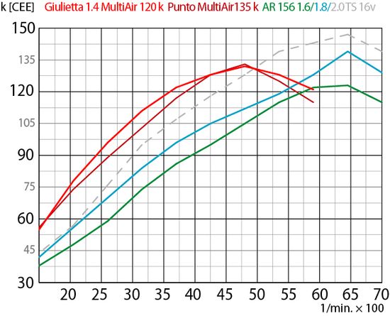 Z křivek jasně vyplývá, že do 5000/min. jednoznačně lépe jedou turbomotory 1.4 MultiAir bez ohledu na udávaný max. výkon. Poněkud zvláštní je, že ve většinovém pásmu otáček je lepší slabší stodvacetikoňový motor v Giuliettě než „papírově“ silnější MultiAir v Puntu, který má pouze nepatrně vyšší špičku výkonového maxima, ale jinak je v téměř celém spektru otáček o něco níž. Od 5000/min. získává navrch atmosférický dvoulitr, nad 6300/min. si ještě škrtne 1.8 TS 16v, ale jen zanedbatelnou úzkou výkonovou špičkou. V průběhu nižšího a středního pásma otáček je tedy i nejslabší přeplňovaná čtrnáctistovka výrazně výkonnější, než jeho atmosférický protějšek (ať jím myslíme třeba dvoulitr). Teprve od 5000/min., má vyšší zdvihový objem atmosféricky plněného motoru nějaký (byť diskutebilní) přínos.