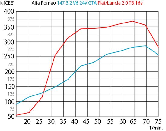 Ve všech srovnávaných grafech jsme dosud nějakou měrou zahrnovali emisní předpisy a další ochranné a zákonné záležitosti. Zkrátka, jednalo se výhradně o sériové motory tak, jak opustily fabriku. Nyní se na ně jen tak pro informaci vykašleme, a postavme proti sobě motory, které mají naprosto sériový klikový mechanismus, ale osadíme je nejostřejšími vačkami, jaké sériové motory snesou bez jakéhokoli mechanického zásahu do motoru, většími vstřikovači, výkonnějším benzinovým čerpadlem, otevřeným výfukem, sníženým odporem sání a přemapujeme na benzin RON 98 a vyšší BEZ ohledu na emisní normy. I když máme v principu stále sériový motor, dostáváme se výkonově trochu jinam. Bohužel v tomto velmi informativním srovnání si musíme vystačit se starým turbomotorem Fiat/Lancia zdvihového objemu 2,0 litru 16v např. z Fiatu Coupé 16v turbo/Lancia Delta Nuova HF/AR 155 Q4/Lancia Delta HF Integrale 16v/Lancia Thema 2.0 16v turbo/Lancia Kappa 16vt  (pro novější TBi máme totiž relevantní data pouze s vyměněným turbem, což by bylo vzhledem k podmínce stále ještě sériového motoru unfair) a postavíme jej proti poslední evoluci motoru Busso 3.2 V6 24v v AR 147 GTA (obdobně 156 GTA/GT 3.2/Spider 3.2/GTV 3.2).