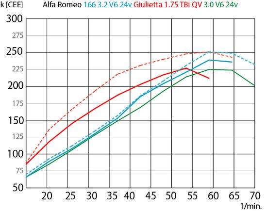 Opět stejný scénář. Červeně turbomotor 1.4 T-Jet, který do 6000/min. vykazuje výrazně vyšší výkon. Na 4200/min. je dokonce o cca 45 koní výkonnější, než 2.5 V6 24v, jehož výkonová křivka je znázorněna modře. Naopak atmosférický motor 2.5 V6 se ujímá vedení od 6000/min a dokáže skutečně hranici max. výkonu posunout o téměř 15 koní výše. Jenom pro zajímavost je zeleně zařazen i „obyčejnější“ motor 1.4 T-Jet s udávaným max. výkonem 165 koní ve voze Fiat Punto Evo/AR MiTo (Euro5), který do 5500/min. rovněž vykazuje vyšší výkon než atmosférický šestiválec, ale od 5600/min. až do výkonového maxima mu již konkurovat nemůže.