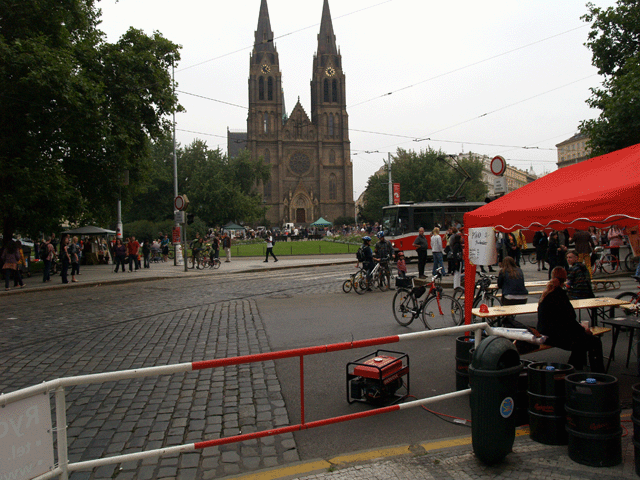 Pochopitelně nemohl chybět ani Pragermutterverein, ústřední myšlenkou jehož existence je „Naše (jejich) děti by pro vás měly být na prvním místě, myslete na ně a ne na sebe!“, zkrátka i Herodes by musel zamáčknout slzu, kdyby to viděl. V blízkém sousedství jejich stánku, přímo před Úřadem MČ Praha 2 pak byl stánek s občerstvením, jehož potřeba po elektrickém proudu byla naplňována vysoce ekologickou motorovou elektrocentrálou, která téměř dokázala to, co kolony aut stále ještě nedovedou – málem jsem se z toho smradu pozvracel. Ale to byl přece dobrý smrad, kdežto mnohem méně odporný smrad z aut je smradem špatným, to přece dá rozum…