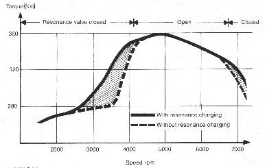 Motor je vybaven 6ti klapkovým rezonančním sáním. Co že to je rezonanční sání? Klapky jsou rozděleny do skupin po třech a mezi nimi je 7. klapka, která tyto dva sací kanály odděluje a otvírá se v závislosti na otáčkách motoru. Při určitých otáčkách začne vzduch v sání pulsovat (rezonovat) a tyto pulsy jdou přesně s tím, jak se otvírají jednotlivé sací ventily což má za následek průnik většího objemu vzduchu do válce a dopad na výkon, který zobrazuje následující graf, který prozrazuje, že při 4000 rpm dojde k otevření rezonančního ventilu. Dojde k změně zvuku motoru a lehce znatelného nárůstu výkonu.