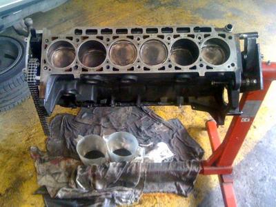 Po pátrání na internetu jsem zjistil, že blok motoru S38 jde nahradit blokem z motoru M30 což je motor, který se dával do E34 530i a 535i s tím, že je třeba dodělat kanál pro odvod oleje z hlavy, ostřik pro chlazení rozvodového řetězu a nechat jej převrtat na 93,4mm. Jako slepý k houslím jsem přišel na známost, která s tímto zkušenosti má a která mi dokonce za symbolickou cenu již připravený blok prodala. Motor M30 nasazovalo BMW od roku 1968 do 1994 což svědčí o jeho povedenosti. Měl jsme tedy připravený blok z roku 1972, dostal jsem k němu i písty z M30, které jsou rovné, proti původním s vybráním. Prodejce mi je dal s tím, že si je taky dává do svých motorů pro vyšší kompresní poměr což nevyžaduje žádnou změnu nebo zesílení a je to znát.