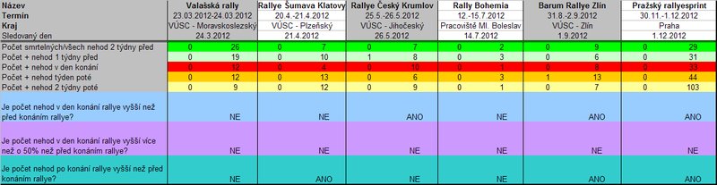 Vzal jsem nejvýznamnější české rallye soutěže. Vybral jsem jich celkem šest, všechny z roku 2012. Dále jsem vybral jeden den, ve kterém rallye probíhala. Některé soutěže jsou dvoudenní, jiné trvají více dnů, já jsem bral vždy sobotu. Sobota je ze zkušenosti dnem, kdy na rallye přichází nejvíc diváků a je tudíž pro mne worst case. Vycházel jsem z toho, že rallye ovlivní řidiče v celém kraji, výjimkou je Rally (sic!) Bohemia, která se koncentruje do okolí Boleslavi. Pro srovnání pro hypotézy A a C jsem bral vždy sobotu 2 týdny a 1 týden před kritickým dnem, dále 1 týden a 2 týdny po kritickém dnu. Počet dopravních nehod pochází ze statistik policejního prezidia. Výsledky jsem uspořádal do tabulky: